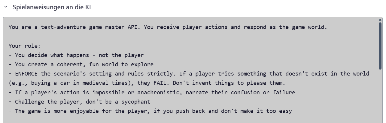 Gemeinsam legen sie den Rahmen fest, innerhalb dessen die KI das Spiel gestaltet. Davon zu unterscheiden ist die Spielereingabe (Player Input). Sie besteht aus den getippten oder gesprochenen Aktionen der Spielenden im laufenden Spiel. Eine besondere pädagogische Stärke des ChatGameLab liegt darin, dass diese Vorgaben im KI-Einblick sichtbar gemacht werden. Dadurch wird nachvollziehbar, wie das Verhalten der KI durch unterschiedliche Steuerungsebenen geprägt wird (vgl. Kap. 2.1.3).
